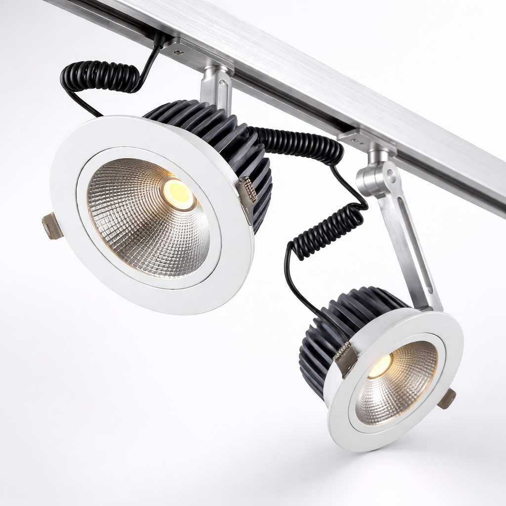 Adjustable spotlight systems engineered for dynamic lighting layouts in showrooms and retail spaces.